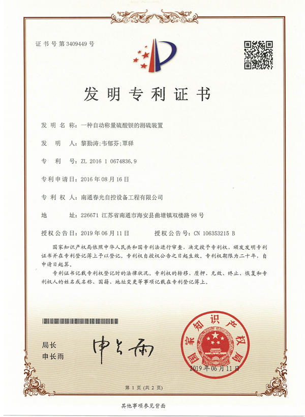 一種自動(dòng)稱量硫酸鋇的測(cè)硫裝置專利證書(shū)