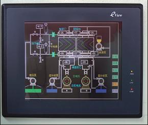 G120-45輥壓機是中型輥壓機,主機系統構成由機械工藝要求提出檢測點和控制點設計了新型自動控制設備,簡稱自控設備。自控設備采用深圳人機EVIEW系列工業彩色觸摸屏(見圖一),操作人員直接在觸摸屏上進行各運行參數設定:監測點各瞬時數據的顯示:在彩色屏上可以監察管道流量,機械運動以不同色彩的動態圖形:本系統保護功能動作,會自動彈出“窗口”指明故障原因。